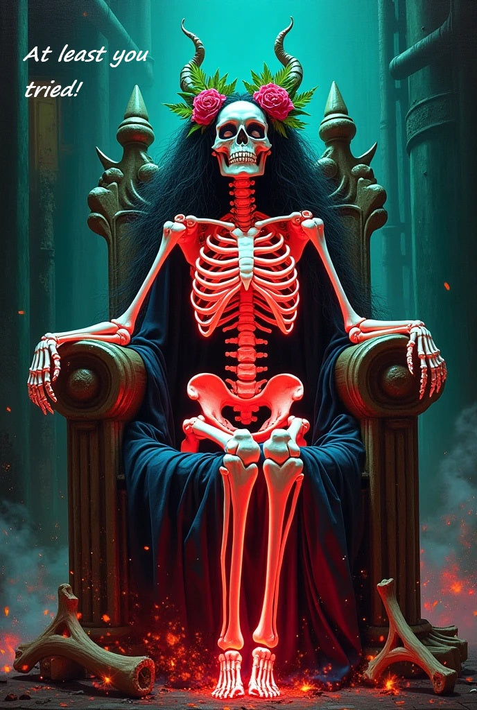 For those moments when effort deserves recognition—even if the results were... questionable. This beautifully unsettling digital gift card features a regal skeletal figure offering the most sardonic encouragement possible.
