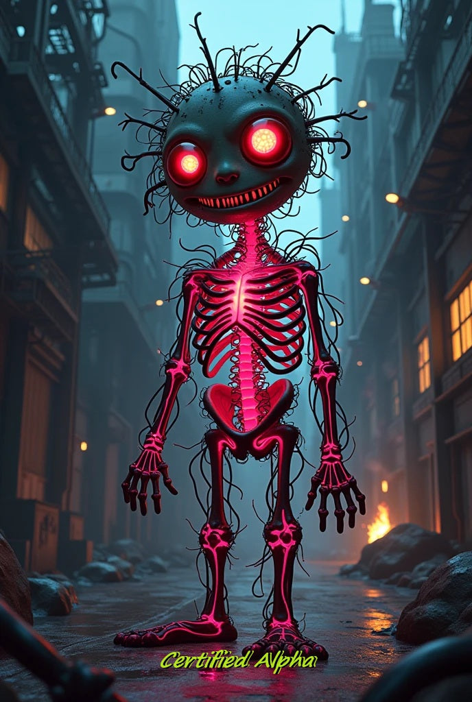 The Certified Alpha digital gift card is perfect for those who appreciate dark humor and premium digital art. Featuring our striking skeleton character with glowing red eyes and an electrifying pink ribcage set against an apocalyptic cityscape, this gift card embodies the Dark Happy aesthetic.