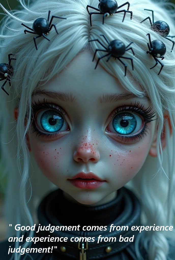A hauntingly beautiful piece that captures the essence of dark wisdom. This premium digital artwork features exquisite detail—from the ethereal blue eyes to the delicate, unsettling presence of ants crawling through platinum hair. It's a visual meditation on growth, mistakes, and the beauty found in life's darker lessons.