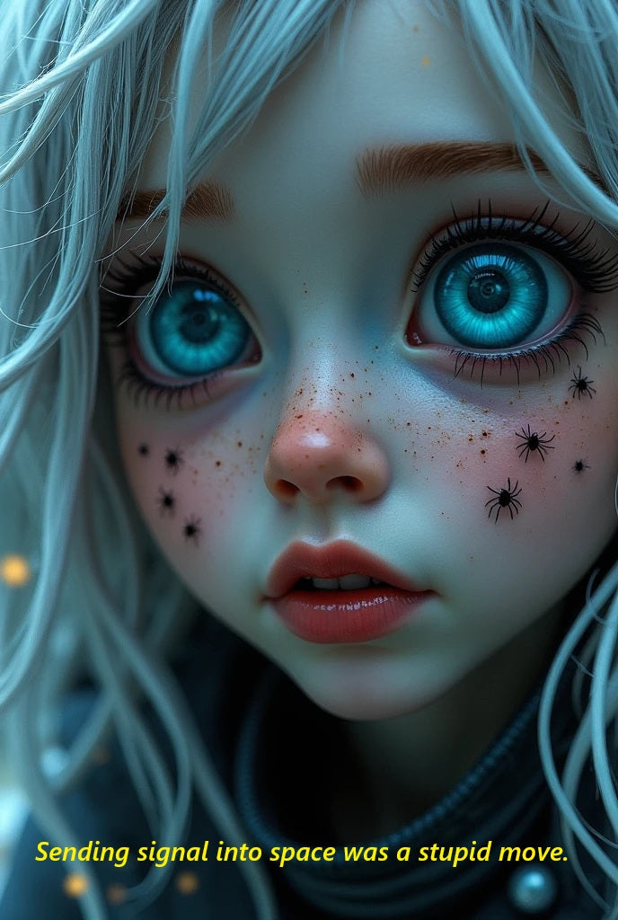 A hauntingly beautiful digital artwork that captures the eerie intersection of innocence and cosmic dread. This premium illustration features striking turquoise eyes, ethereal blue hair, and delicate spider motifs—a perfect embodiment of our beautifully unsettling aesthetic.