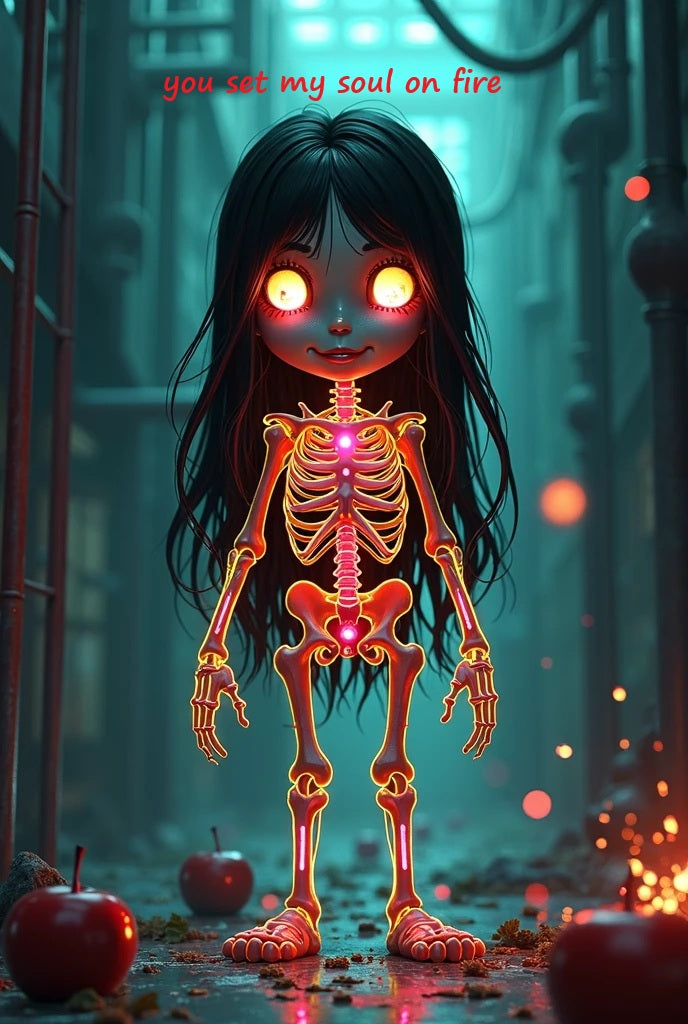 There's something beautifully haunting about passion that lights you up from the inside out—the kind that sets your soul ablaze and makes your whole skeleton glow. This darkly whimsical gift card captures that intensity with striking gothic artwork featuring a big-eyed character whose fiery skeletal system radiates against a moody teal backdrop.